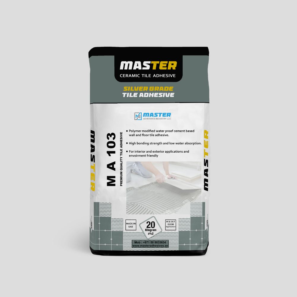 Silver Tile Glue MA103 is a general-purpose, water resistant tile adhesive formulated with black cement, ideal for various tiling applications. It provides reliable bonding strength for ceramic and porcelain tiles, ensuring durable results on both walls and floors.